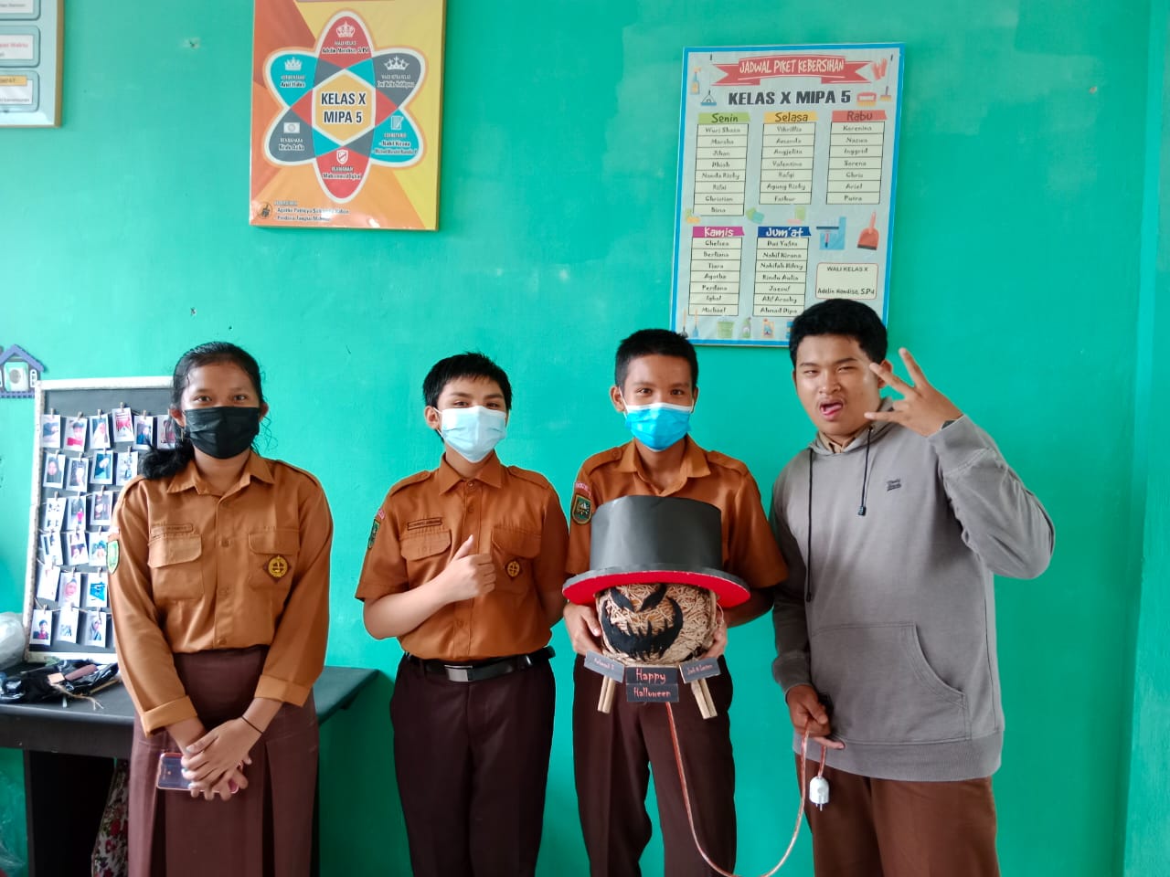 Kerajinan ini adalah lampu dekoratif bertema Halloween yang dibuat dari balon yang dikelilingi tali, topi silinder dari karton dan styrofoam, dan kerta katun hitam berbentuk ekspresi Jack O’ Lantern. Kerajinan ini saya dan teman teman saya buat untuk tugas Prakarya saat kami masih kelas 1 SMA. Kami membuat lampu hias ini dengan tema Halloween karena saat itu berdekatan dengan hari Hallowen. Di gambar itu, aku yang pakai masker hijau sambil megang lampunya.